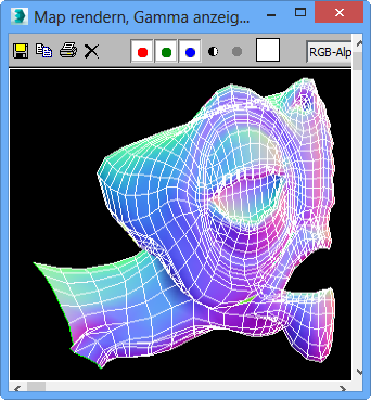 Das Dialogfeld UVs rendern im Editor UVW zuweisen ermöglicht Ihnen, die Textur-Mapping-Daten eines Modells in Form einer Bitmap-Bilddatei als Vorlage zu exportieren. Sie können diese Vorlage anschließend in ein 2D-Bildbearbeitungsprogramm importieren, mit der gewünschten Farbgebung versehen und es dann wieder als Textur-Map in 3ds Max importieren, um es dort auf das Modell anzuwenden. Die exportierte Datei sieht aus wie eine Bildschirmabbildung des Editor-Fensters, allerdings ohne Hintergrundtextur, dafür aber mit zusätzlichen Optionen zum Festlegen von Farben und Alpha-Optionen für die Kanten und deren Bereiche.