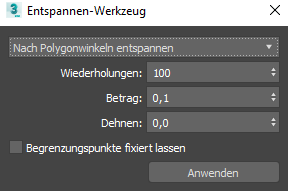 Falls dies offenbar hilft, klicken Sie wiederholt auf "Anwenden" oder ganz einfach auf "Entspannen starten", und warten Sie, bis die Überlappung behoben ist. Andernfalls machen Sie den Schritt rückgängig (STRG+Z) und probieren stattdessen "Mit Flächenwinkeln entspannen" oder erhöhen den Wert "Betrag", ändern den Wert "Dehnen" bzw. versuchen mehrere dieser Möglichkeiten gleichzeitig.