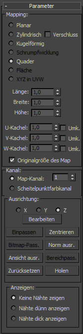 Im Rollout "Koordinaten" wird der Parameter "Map-Kanal" aktiviert; übernehmen Sie den Wert 1.