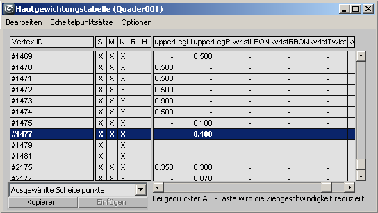 Die Gewichtungstabelle für den Modifikator "Haut" wird zum Ändern der Scheitelpunktgewichtungen für mehrere Scheitelpunkte und Bones gleichzeitig eingesetzt. Diese Tabelle wird angezeigt, wenn Sie auf die Schaltfläche "Gewichtungstabelle" klicken.