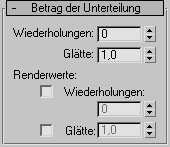 Mit den Einstellungen in diesem Bereich können Sie während des Rendervorgangs eine andere Anzahl von Glättungswiederholungen und einen anderen Wert für Glätte auf das Objekt anwenden. Normalerweise würden Sie hier eine geringe Zahl von Wiederholungen und einen niedrigen Wert für Glätte zum Modellieren sowie höhere Werte zum Rendern verwenden. So können Sie mit einem Objekt niedriger Auflösung schnell in den Ansichtsfenstern arbeiten und dann zum Rendern ein hochwertigeres Objekt verwenden.