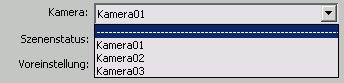 Standardmäßig rendert eine Aufgabe das aktive Ansichtsfenster wie in der Aufgabenwarteschlange in der Spalte "Kamera" für den Eintrag "Ansichtsfenster" angegeben. In dieser Liste können Sie eine beliebige Kamera der Szene für die markierte Aufgabe auswählen. Diese neue Kamera wird in der Spalte "Kamera" der Aufgabenwarteschlange angezeigt.