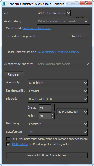Weitere Informationen über Autodesk Rendering finden Sie unter http://www.autodesk.com/adsk360-rendering-help-about-deu. Diese Hilfeseiten enthalten einige Details zum Rendern von 3ds Max-Szenen in der Cloud.