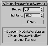 Der Modifikator "Kamerakorrektur" wendet eine Zweipunkt-Perspektive auf eine Kameraansicht an. Als Vorgabe verwenden Kamera-Ansichten die Dreipunktperspektive, in der vertikale Linien mit zunehmender Höhe zusammenlaufen. Bei der Zweipunktperspektive bleiben vertikale Linien vertikal.