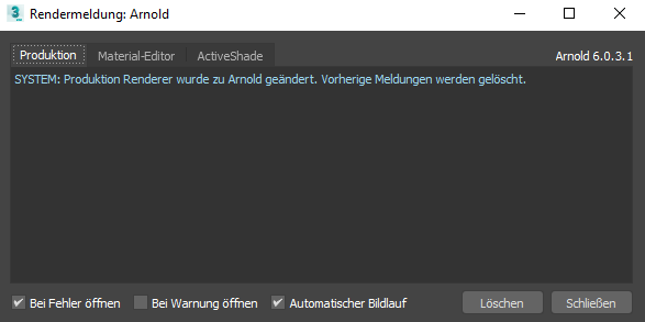 Darüber hinaus ist das Meldungsfeld in drei Registerkarten unterteilt. Informationen für die Unterscheidung zwischen Produktion, Material-Editor und ActiveShade-Renderer finden Sie hier: