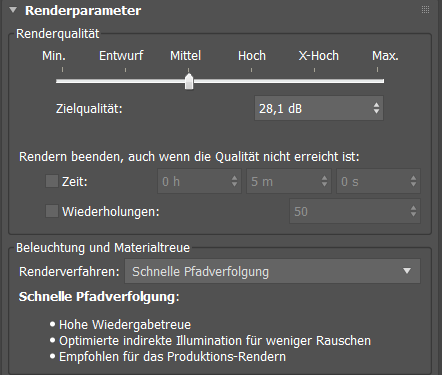 Das Rollout Renderparameter enthält Einstellungen zum Steuern der Renderqualität, der Beleuchtung und der Materialtreue.