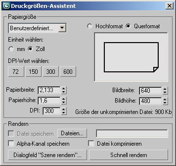 Wenn Sie direkt vom Druckgrößen-Assistenten aus rendern, können Sie das aktuelle Frame in eine Datei im TIFF-Format ausgeben. Dabei handelt es sich um ein in der Verlagsbranche häufig verwendetes Format. Verwenden Sie zum Rendern in ein anderes Format die Schaltfläche "Rendern einrichten" im Assistenten.
