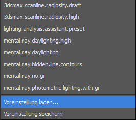 Zusätzlich zu den vorgegebenen Voreinstellungen, die in 3ds Max enthalten sind, können Sie eigene erstellen. Am Ende der Liste der Voreinstellungen finden Sie zwei Optionen, mit denen Sie eigene angepasste Voreinstellungen erstellen und verwenden können: