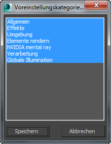 Wenn Sie diese Option wählen, öffnet 3ds Max zunächst ein Dateiauswahl-Dialogfeld, in dem Sie einen Namen für die RPS-Datei eingeben können. Danach wird das Dialogfeld "Voreinstellungskategorien auswählen" angezeigt.