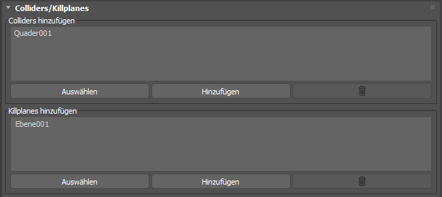 - Klicken Sie auf Auswählen, um Objekte in der Szene auszuwählen, die als Killplanes hinzugefügt werden sollen, oder klicken Sie auf Hinzufügen, um Killplanes in einem Dialogfeld auszuwählen. Klicken Sie auf Löschen, um eine ausgewählte Killplane zu löschen.