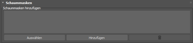 - Klicken Sie auf Auswählen, um Objekte in der Szene auszuwählen, die als Schaummasken hinzugefügt werden sollen, oder klicken Sie auf Hinzufügen, um eine Schaummaske in einem Dialogfeld auszuwählen. Klicken Sie auf Löschen, um eine ausgewählte Schaummaske zu löschen.