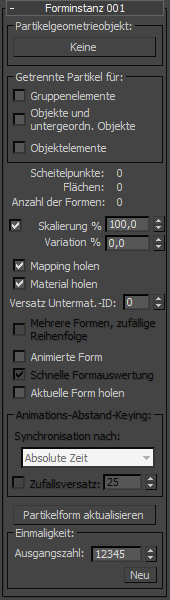 In den meisten Fällen aktualisiert das Partikelfluss-System instanzierte Partikel automatisch, wenn Änderungen am Referenzobjekt vorgenommen wurden. In manchen Fällen werden jedoch die Partikelinstanzen unter Umständen nicht aktualisiert, wenn Sie ein Objekt weit unten in der Hierarchie ändern. Klicken Sie in solchen Fällen auf die Schaltfläche "Partikelform aktualisieren", um die Instanzen zu aktualisieren.
