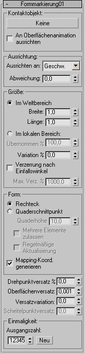 Max. Verz[errung] % Mit dieser Option wird der maximale Prozentsatz eingestellt, um den Partikelfluss die Markierung dehnen kann. Diese Option ist nur verfügbar, wenn die Option "Verzerrung nach Einfallswinkel" aktiviert ist. Vorgabe = 1.000.