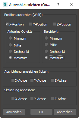 Bereich "Position angleichen" die Option "X-Position", und deaktivieren Sie "Y-Position" und "Z-Position", so dass nur die Links-Rechts-Position der beiden Objekte angeglichen wird.