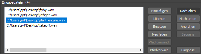 Die Dateien werden im Bereich "Eingabedateien" als Liste angezeigt. Es kann hilfreich sein, die Dateien in der Reihenfolge anzuordnen, in der ihre Klänge in der Klangspur zu hören sind (dies ist jedoch nicht obligatorisch).