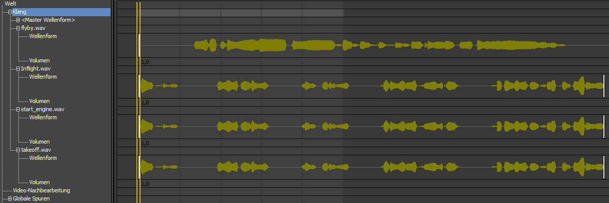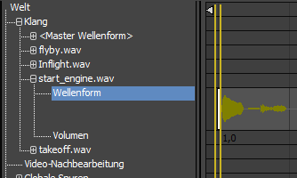 Es bietet sich an, das Audio-Segment start_engine in die Phase, während der das Flugzeug die Startbahn entlangrollt, hinein zu verlängern, um ein knatterndes Geräusch beim Start zu simulieren.
