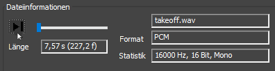 Der Bereich "Dateiinformationen" enthält auch Optionen, mit deren Hilfe Sie steuern können, wie die Datei in der Szene wiedergegeben wird. Sie können die Datei beispielsweise in einer Schleife abspielen, so dass sie so oft wie festgelegt wiederholt wird, oder das erste und das letzte Frame eingeben, bei dem der Klang abgespielt wird. Mithilfe der Option "Aktiv" können Sie die Klangdatei in die Wiedergabe aufnehmen oder sie davon ausschließen.