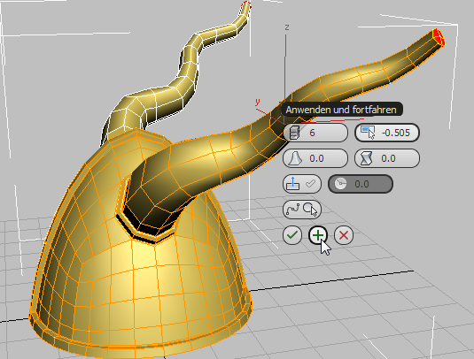 3ds Max extrudiert die Hörner noch weiter. Dies ist in anderen Ansichtsfenstern einfacher zu erkennen. Sie können jedoch auch in der Perspektivansicht navigieren, wie in der Abbildung gezeigt.