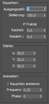 - Aktivieren Sie in der Gruppe "Rauschen" die Option "Fraktal", und legen Sie im Bereich "Stärke" die X-, Y- und Z-Achsen auf 30.0 fest.