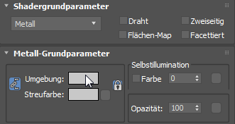 "Blinn", benannt nach James Blinn, dem Pionier im Bereich Computergrafik, ist der vom Standardmaterial vorgabemäßig verwendete Shadertyp. Ein Shader bestimmt, wie das Material mit Licht interagiert. "Streulicht" bezieht sich auf die Farbe des Grundmaterials. Sie finden weitere Informationen über Shader und Materialien in der 3ds Max-Hilfe.