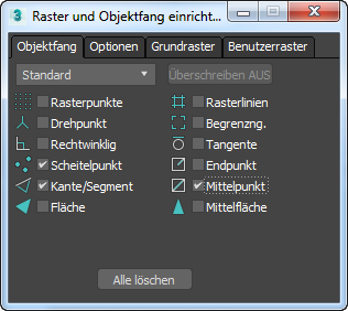 - Klicken Sie auf der Registerkarte "Objektfang" auf "Alle löschen", und aktivieren Sie dann die Optionen "Scheitelpunkt", "Kante/Segment" und "Mittelpunkt".
