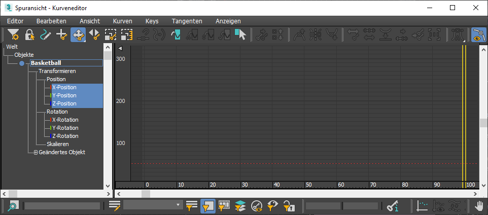 3ds Max öffnet den Kurveneditor. Die Spuren, die Sie soeben für den Ball erstellt haben, sollten links zu sehen sein und die Kurven selbst im Kurvenfenster rechts.