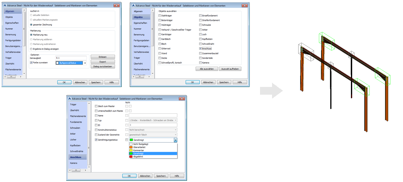 Jedem Genehmigungsstatus ist eine andere Farbe zugewiesen. Nach dem Suchen der gewünschten Verbindungen werden die Ergebnisse im Modell mit der jeweiligen Genehmigungsstatus-Farbe markiert.
