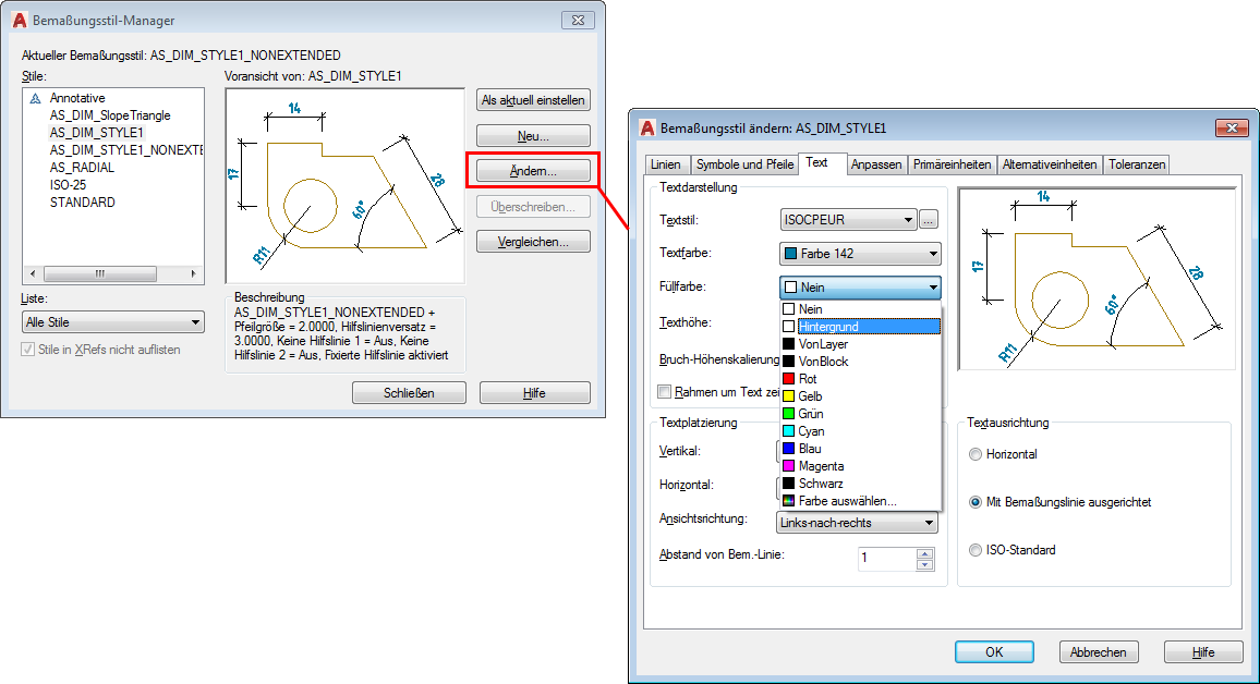 Die Funktion verwendet dieselben AutoCAD-Mechanismen, die dem Text einen gefüllten Hintergrund zuweisen.
