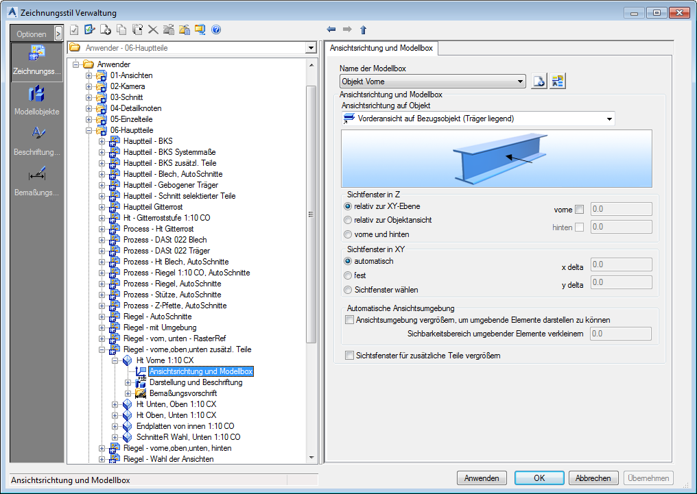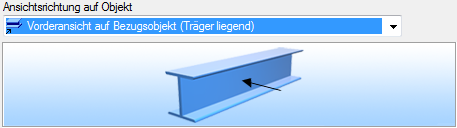 • Für Werkstattzeichnungen sollten Sie in den meisten Fällen die Option Vorderansicht auf Bezugsobjekt (Träger liegend) verwenden.