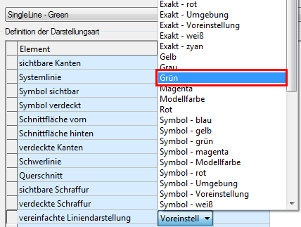 (Festlegen) für die Kategorie Darstellungsvorschrift, um die Gruppe Darstellungskonfiguration zu öffnen. Die in der vordefinierten Installation enthaltene vorgegebene Darstellung SingleLine ist mit dem auf die vorgegebene Farbe festgelegten Element Vereinfachte Linien konfiguriert. Das bedeutet, dass Advance Steel für Objekte mit vereinfachter Liniendarstellung die Farbe verwendet, die in den Vorgabeeinstellungen der Management Tools festgelegt wurde.