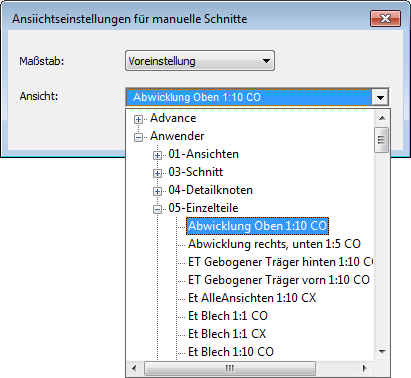 Sie können auf die Liste der für manuelle Schnitte in der Zeichnungsstil Verwaltung verfügbaren Ansichtsanfragen auf der folgenden Ebene zugreifen: