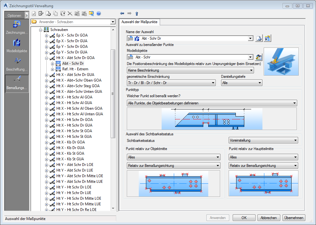 Eine Vorschrift der Maßpunktauswahl enthält Einstellungen für Modellobjekte und geometrische Einschränkungen, Punkttyp, Position am Objekt oder am Hauptteil.
