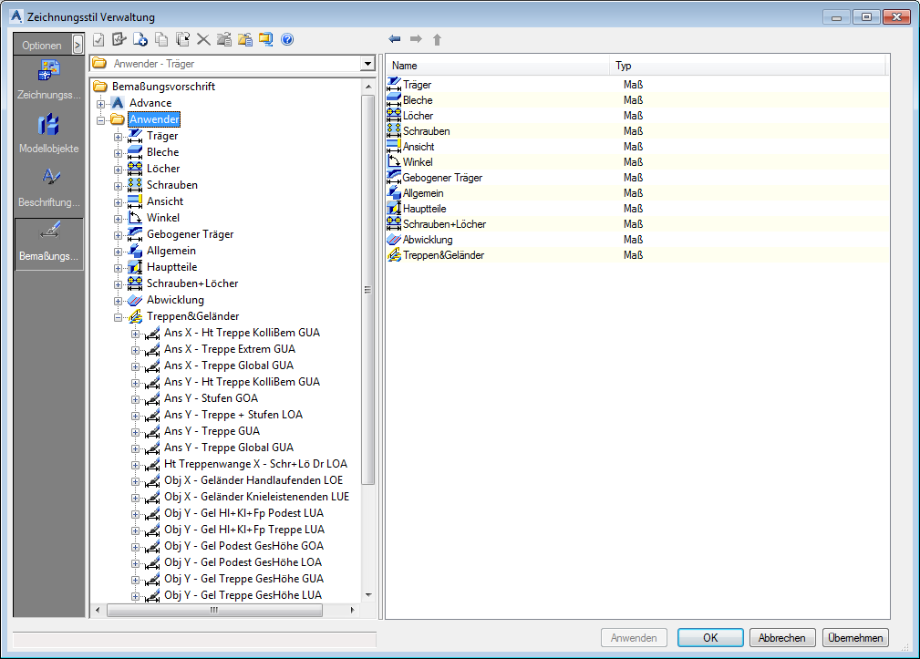 Wählen Sie Bemaßungsanfragen aus der Gruppe Komponente. Die Baumstruktur zeigt die Bemaßungsvorschriften nach der Art des Advance-Objekts (Träger, Bleche usw.) gruppiert an. Alle Verwaltungsfunktionen gelten für die Bemaßungsvorschriften.
