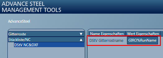 Der Vorgabewert, der diese Darstellung steuert, wird als DStV Gitterrostnamen bezeichnet und befindet sich in der Management Tools-Anwendung. Dieser Vorgabewert muss den Parameter %RunName verwenden: