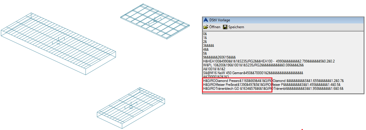 Der in den Advance-Eigenschaften angezeigte Name von Gitterrosten kann in DStV-Stücklisten angezeigt werden.