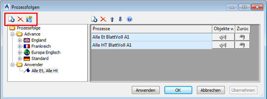 Mit den Schaltflächen in der oberen linken Ecke des Dialogfelds Prozessfolgen können Sie die vorhandene (Prozess)folge benennen, eine Prozessfolge kopieren oder eine neue Prozessfolge erstellen.
