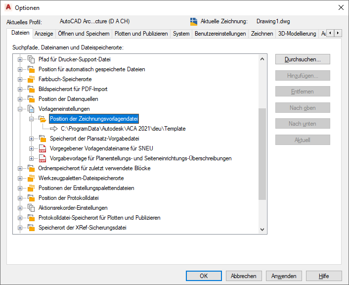 - Layer-Schlüsselstile und Layer-Standards: Diese Inhalte können zwar in einer Vorlage gespeichert werden, es ist jedoch empfehlenswert, sie stattdessen in einer Bibliothekszeichnung aufzubewahren. Im Dialogfeld Zeichnung einrichten können Sie sicherstellen, dass in neue Zeichnungen und Zeichnungen, die sich bereits in Bearbeitung befinden, beim Öffnen stets automatisch der aktuelle Layer-Schlüsselstil importiert wird. Sie arbeiten dann immer mit der aktuellen Version.