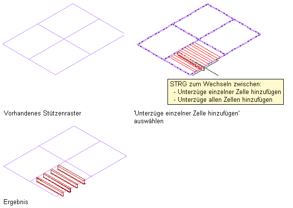 | Hinzufügen eines Unterzugs entlang einem oder mehreren Segmenten eines Stützenrasters | Zeigen Sie mit dem Cursor auf ein Segment im Raster, um eine Vorschau des Unterzugs anzuzeigen, und klicken Sie, um den Unterzug zum Segment hinzuzufügen, oder drücken Sie die STRG-Taste, und klicken Sie, um Unterzüge entlang allen Segmenten der Rasterlinie hinzuzufügen, oder drücken Sie zweimal die STRG-Taste, und klicken Sie, um Unterzüge entlang allen Segmenten des Rasters hinzuzufügen. Drücken Sie die EINGABETASTE, um den Befehl zu beenden. |