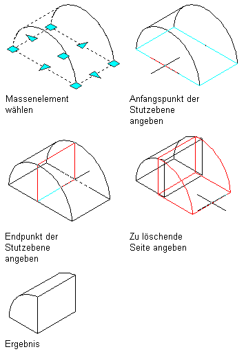 Gehen Sie wie folgt vor, um ein Massenelement zu stutzen. Die von Ihnen festgelegte Teilungsebene fungiert als Stutzlinie, wobei Sie angeben, welche Seite des Massenelements entfernt werden soll.