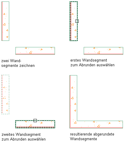 In der folgenden Abbildung wird gezeigt, wie zwei Wandsegmente mit einem angegebenen Radius abgerundet werden.