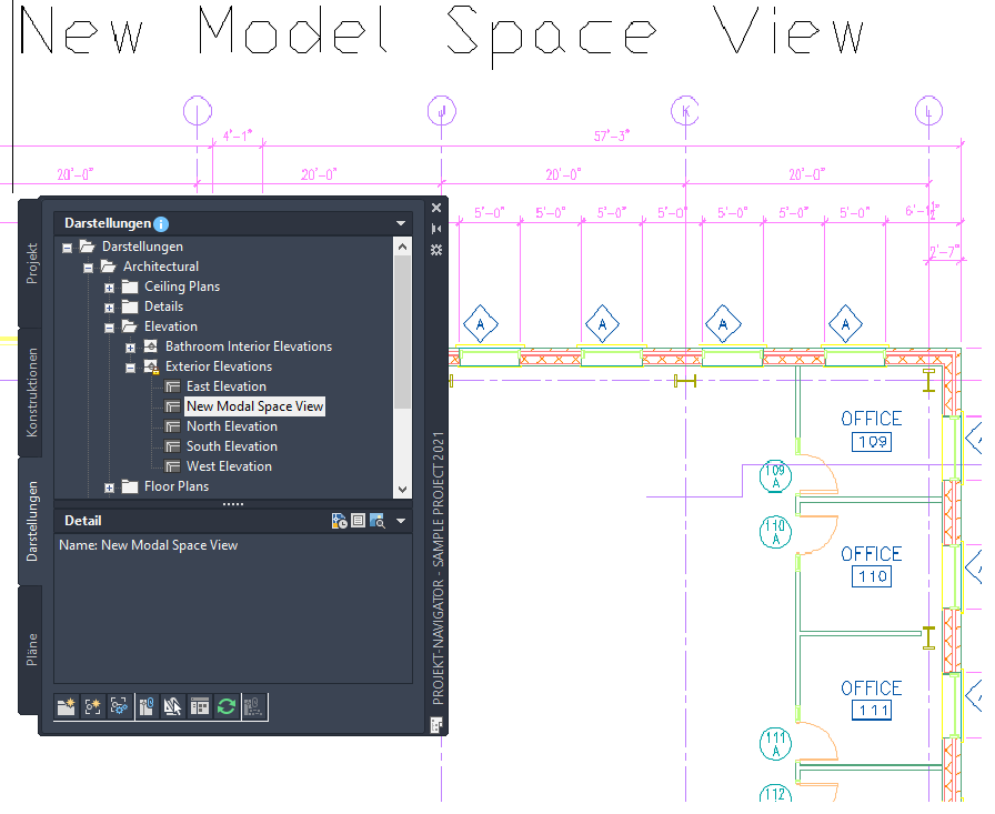 Die Standardansichtsvorlage sollte gespeichert werden, sodass eine Zeichnung erstellt wird, die auf der Registerkarte Modell geöffnet wird. Wenn Sie eine neue Ansichtszeichnung erstellen, werden alle der Ansicht zugeordneten Konstruktionen in der Ansichtszeichnung referenziert. Wird beim Öffnen der Vorlage nicht der Modellbereich angezeigt, wird das Gebäude im Papierbereich referenziert.