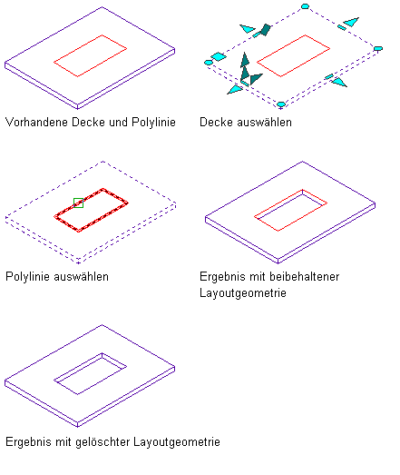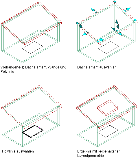 - Aussparungen, die von einer geschlossenen Polylinie erstellt werden, werden von der Polylinie in die Decke oder das Dachelement projiziert, wobei das aktuelle Benutzerkoordinatensystem (BKS) verwendet wird.