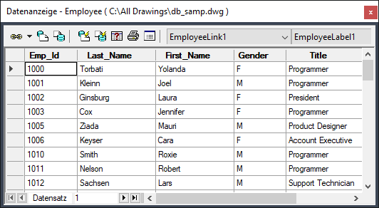 Doppelklicken Sie auf eine Datenbanktabelle oder eine Verknüpfungsvorlage im dbConnect-Manager. Durch Doppelklicken auf eine Verknüpfungsvorlage, für die in der entsprechenden Zeichnung noch keine Verknüpfungen erstellt wurden, rufen Sie das Dialogfeld Verknüpfungsvorlage auf. Die Datenbanktabelle wird, je nach den DB-Verbindungseinstellungen auf der Registerkarte System des Dialogfelds Optionen, entweder im Bearbeitungsmodus oder schreibgeschützt angezeigt.