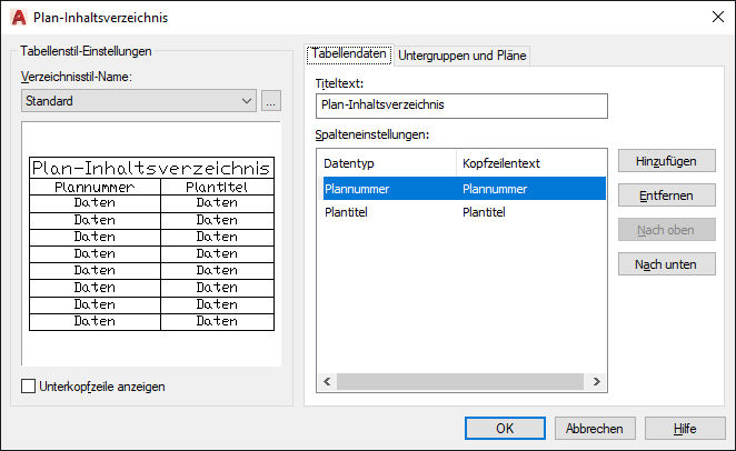 Dieses Verzeichnis kann in beliebige Pläne m aktuellen Plansatz eingefügt werden. Normalerweise wird sie jedoch in den Titelplan aufgenommen.