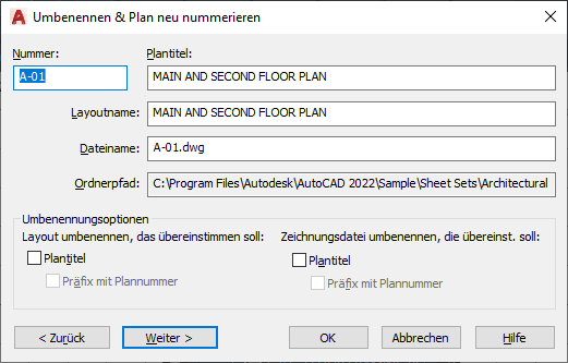 Lädt den nächsten Plan in dieses Dialogfeld. Diese ist eine einfache Möglichkeit, eine Reihe von Plänen neu zu nummerieren oder umzubenennen.