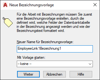 In bestimmten Fällen müssen Bezeichnungsvorlagen bearbeitet werden. Beispiel: Sie möchten zusätzliche Felder aus der Datenbanktabelle in der Zeichnung anzeigen oder die Schrift oder die Größe des Bezeichnungsobjekts ändern. Darüber hinaus können Sie mehrere Einstellungen für den Abstand festlegen, die sich auf den Einfügepunkt der Bezeichnungen und - bei zugeordneten Bezeichnungen - auf die zugehörigen Führungsobjekte auswirken.