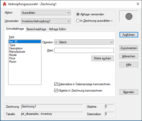 Führt die aktuelle Abfrage aus der Verknüpfungsauswahl aus oder schließt das Dialogfeld Verknüpfungsauswahl vorübergehend, sodass Sie grafische Objekte aus der Zeichnung auswählen können. Wenn die Option Abfrage verwenden aktiviert ist, wird die Schaltfläche Ausführen angezeigt. Wenn die Option In Zeichnung auswählen ausgewählt wurde, wird die Schaltfläche Auswählen angezeigt. Nach Auswahl der Schaltfläche Ausführen oder Auswählen können Sie weitere Abfragen anwenden oder zusätzliche grafische Objekte in den Auswahlsatz aufnehmen.