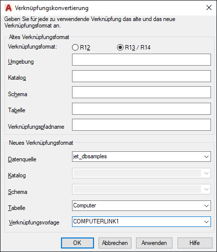 Format der zu konvertierenden Verknüpfung. Für R12 und R13/R14 werden verschiedene Felder angezeigt.