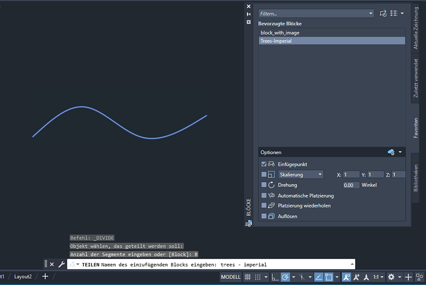 Bisher haben wir die Befehle TEILEN und MESSEN verwendet, um Punkte auf Objekten zu platzieren. Sie können aber auch die Option Block verwenden, um Blöcke entlang der Länge oder des Umfangs eines Objekts zu platzieren. Im folgenden Beispiel verwenden wir TEILEN, um fünf Blöcke (in diesem Fall Bäume) in gleichmäßigem Abstand entlang eines Splines zu platzieren.