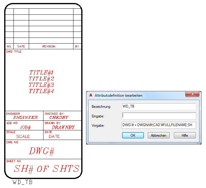 Verwenden Sie das Dienstprogramm Schriftfeld einrichten, um diese Informationen dem Attribut WD_TB zuzuordnen. Das Dienstprogramm Schriftfeld einrichten wird direkt auf die WD_TB-Attributdefinition angewendet und kann nicht in einer Zeichnung verwendet werden, die ein als Block eingefügtes Schriftfeld enthält. Öffnen Sie die DWG-Datei des Basisschriftfelds, bevor Sie Schriftfeld einrichten ausführen.